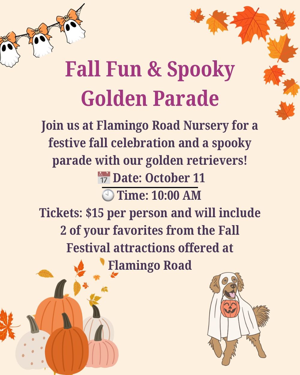 Get ready for some fall magic and golden smiles at the Fall Fun & Spooky Golden Parade at Flamingo Road Nursery. Bring your 🐕 golden retriever and dress them in their spookiest 👻 or cutest costume for a festive day surrounded by 🎃 pumpkins, friends, and wagging tails.