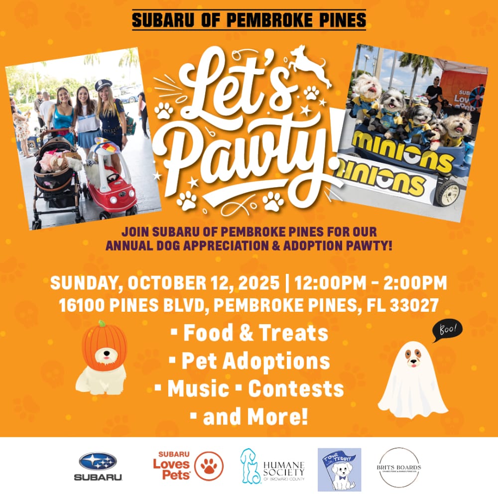 Get ready for the annual Dog Pawty at Subaru 🚗 of Pembroke Pines! Bring your furry friends and enjoy some pet-friendly fun.