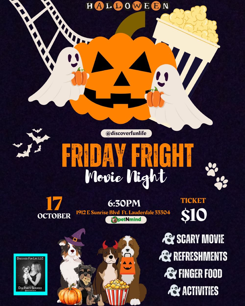 Dress your pup in their best Halloween costume for a 💀 frightfully fun evening. Friday Fright Movie 🎞️ Night will feature horror films, finger foods, refreshments, and plenty of spooky activities for a memorable night out. Please RSVP in advance.