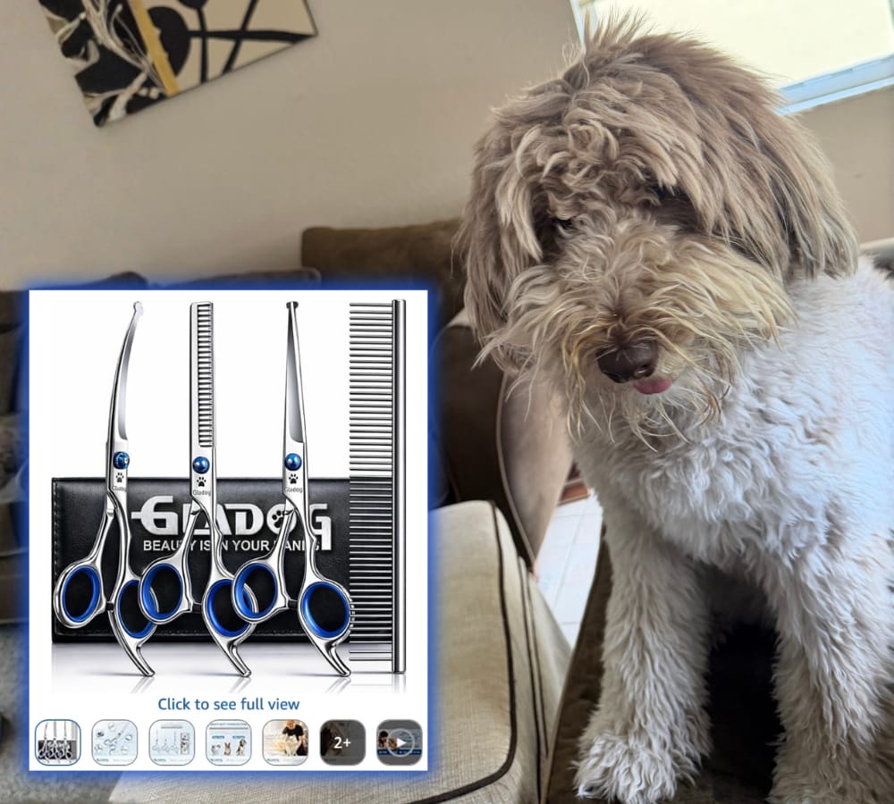 I grabbed this Professional 5-in-1 Grooming Scissors Set for quick touch-ups between grooms, especially for trimming the hair around Ferris' eyes so she can see where she's going. The round safety tips make me feel better using them near the face, and for $14.98 with 4.5 stars ⭐️ and nearly 18,000 reviews, it looked like a solid buy. Check out my pup Ferris in this photo - lol.